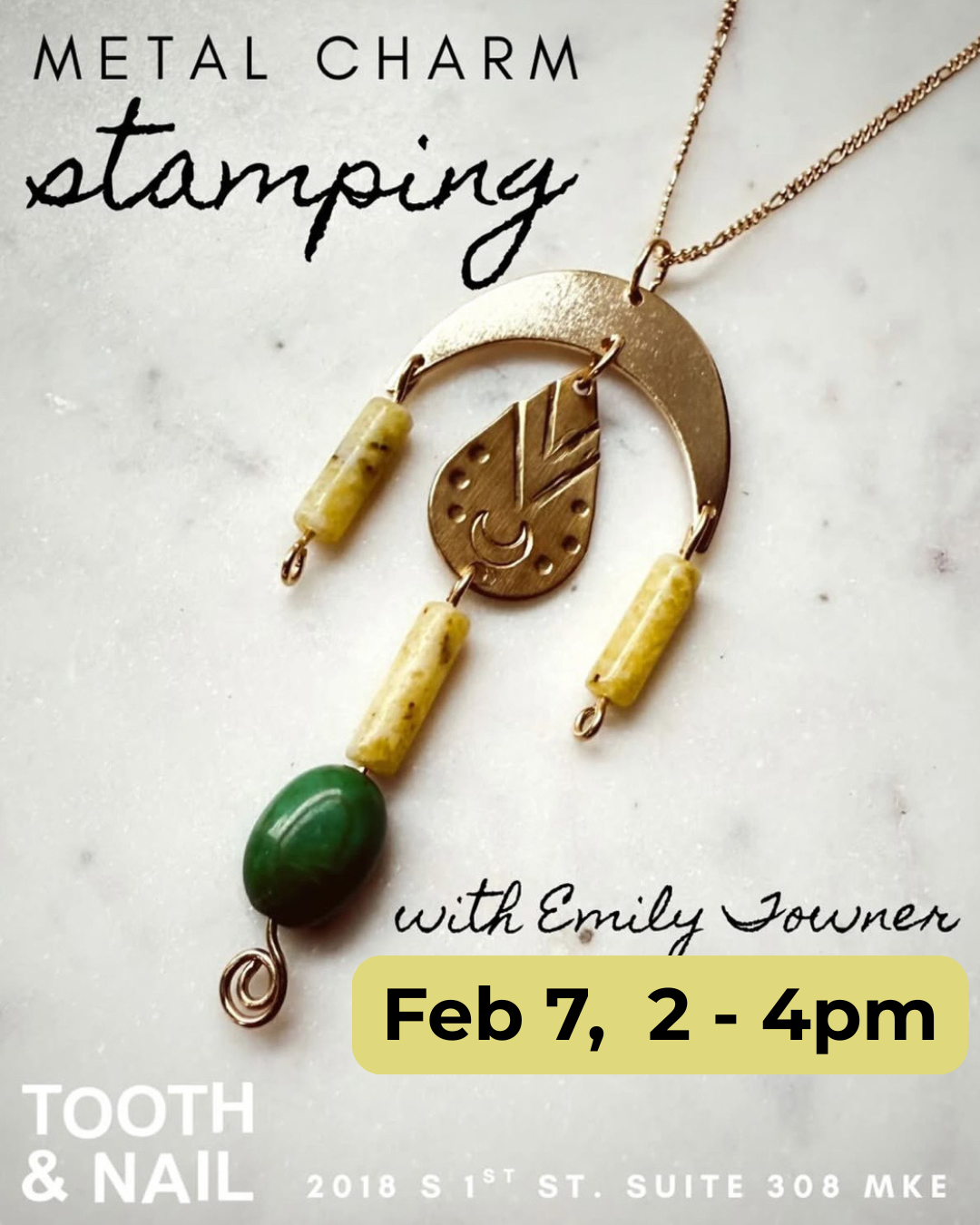 This is a make & take jewelry workshop where creativity meets good vibes! Total beginners and experienced makers alike are welcome in this hands-on session, all about personal expression and playful design. You’ll learn the basics of metal stamping to create your own custom charm, then add beads and details to make it truly one-of-a-kind. You’ll have the choice between 1 sterling chain plus small charm, 1 gold fill chain plus brass charms, 1 brass bracelet cuff, or a set of brass earrings with gold fill hooks. Choose your word, symbols, and colors, and we’ll provide all the tools, materials, and guidance you need. Come solo or bring a friend and leave with a finished piece that’s uniquely for you or perfect for gift giving.