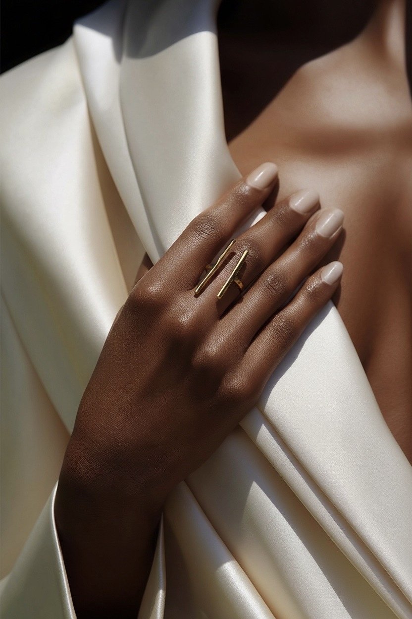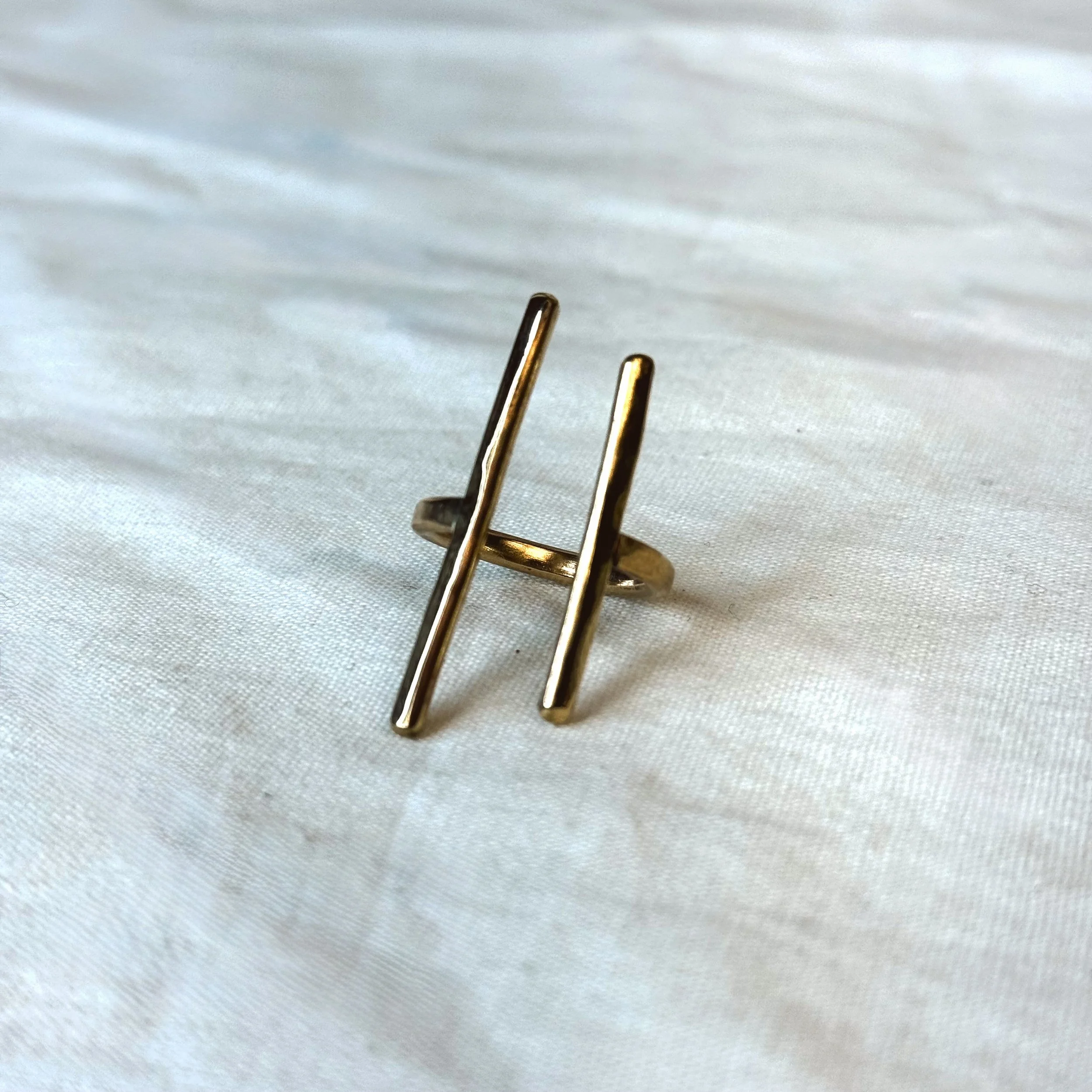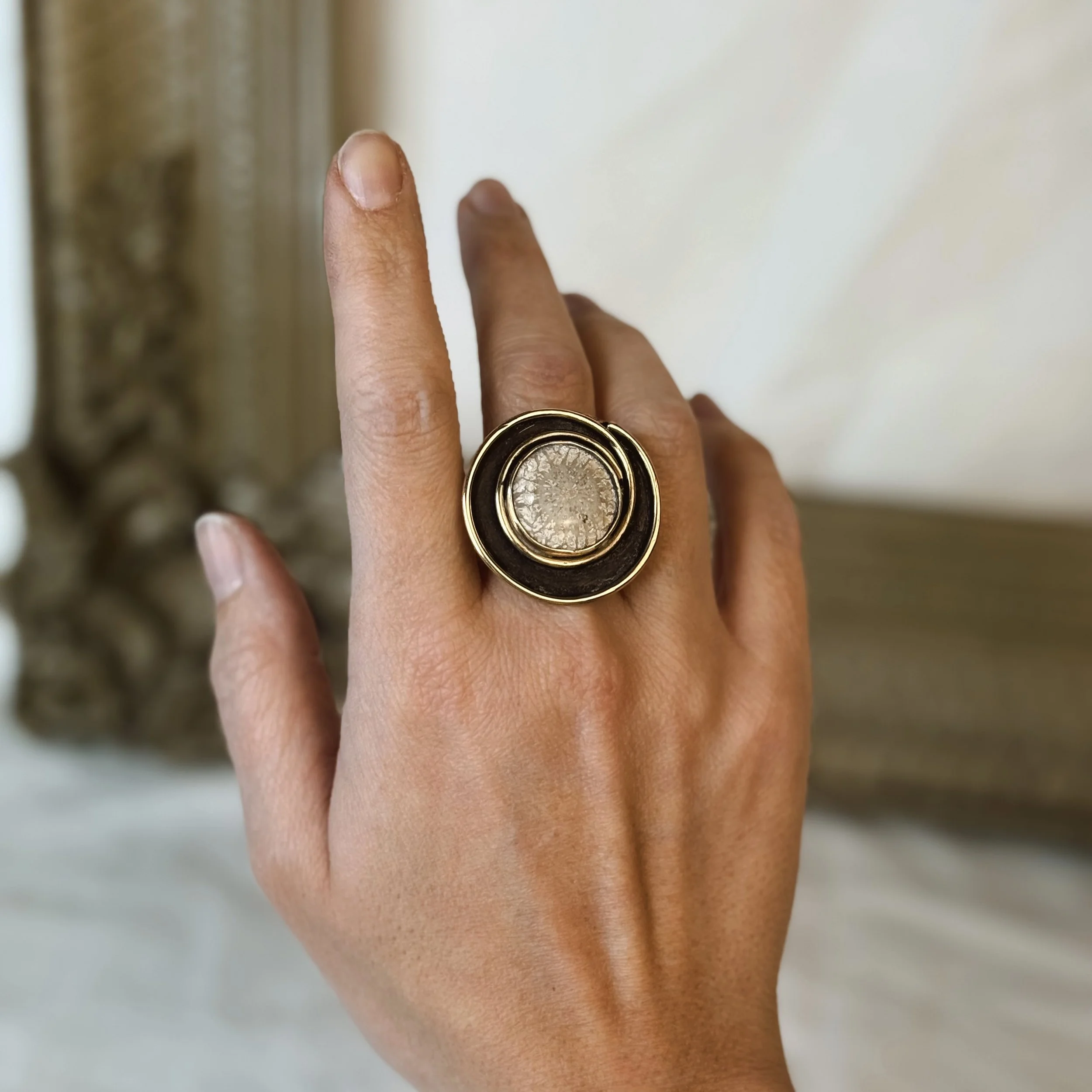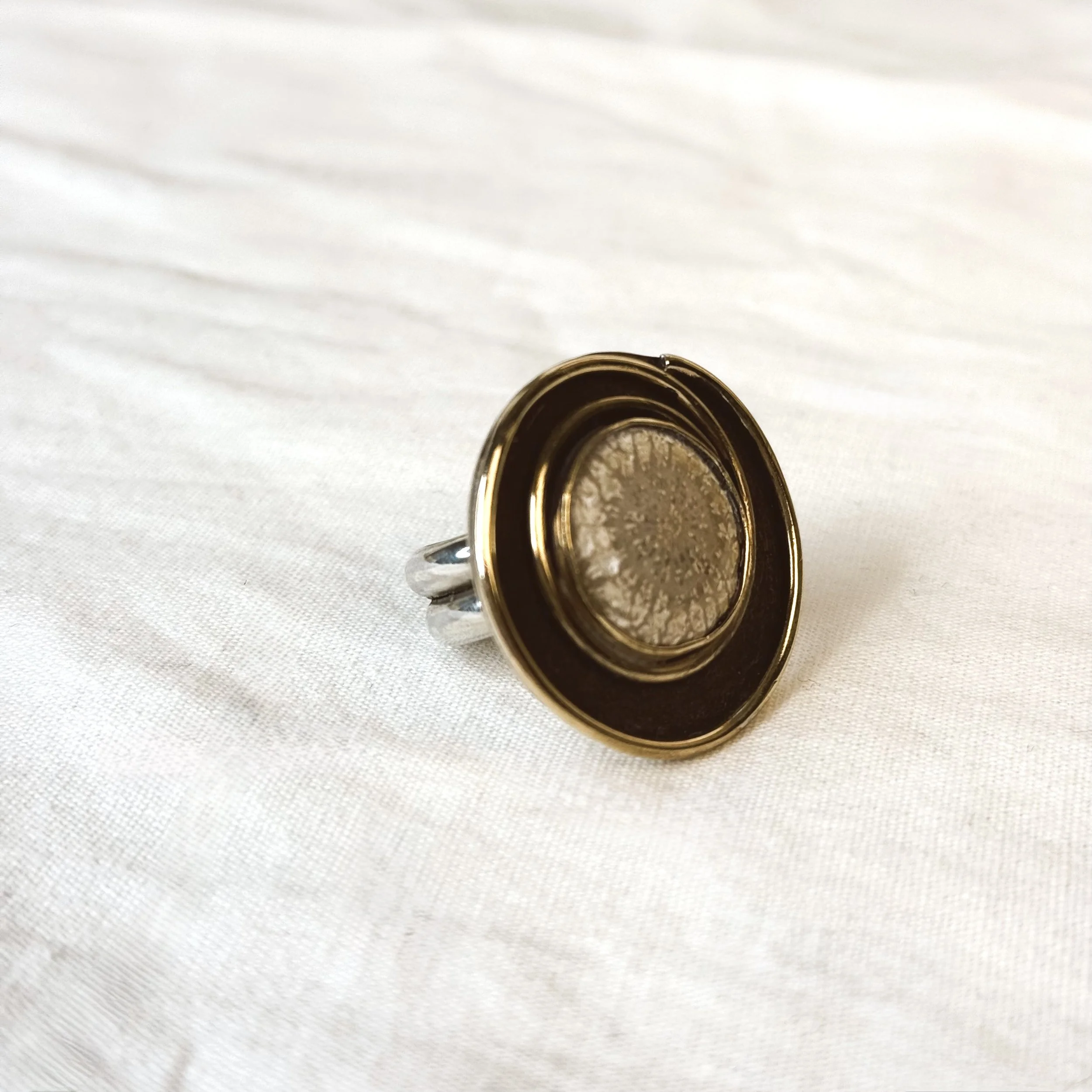 Coral fossil & oxidized brass ring on an adjustable double sterling silver band