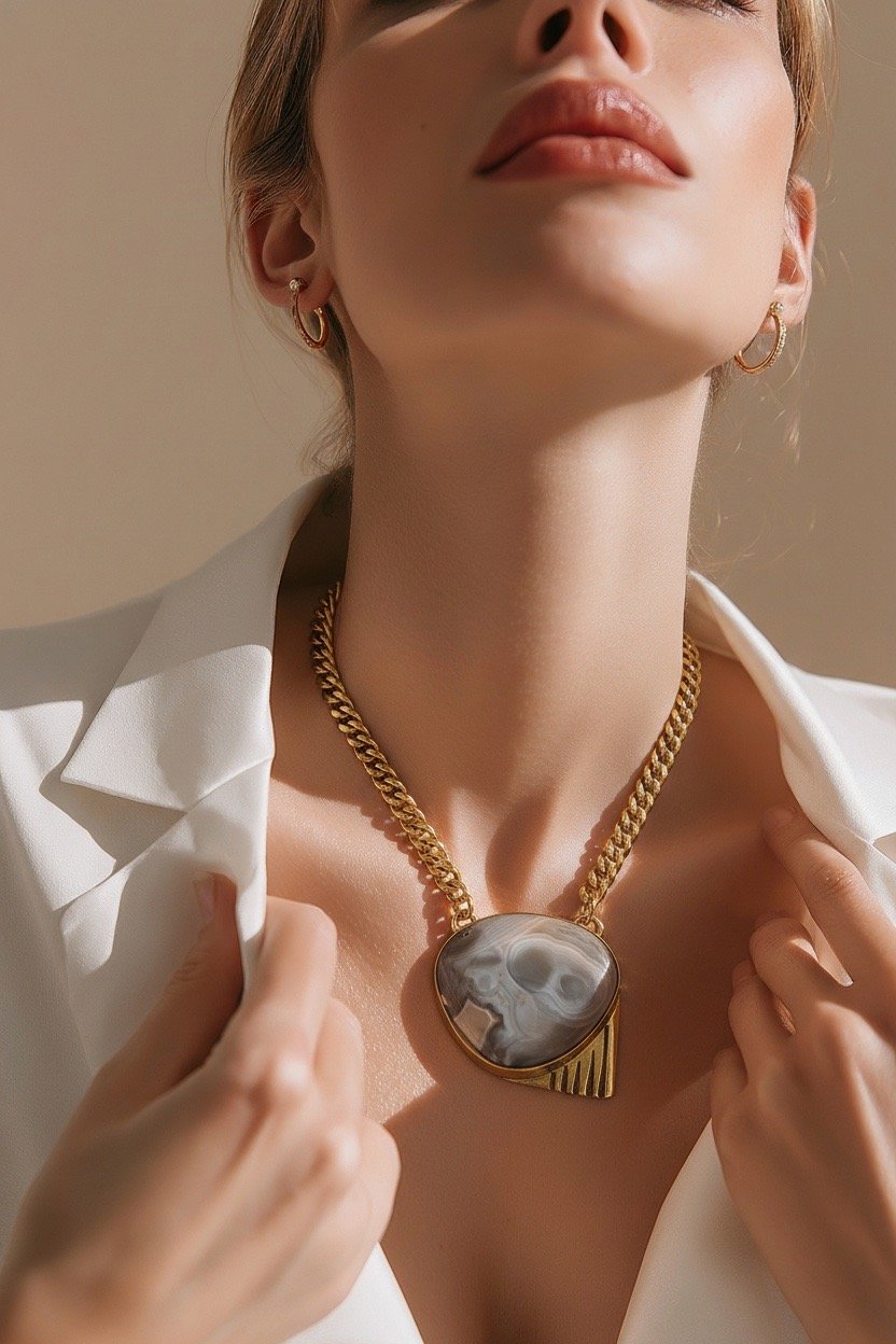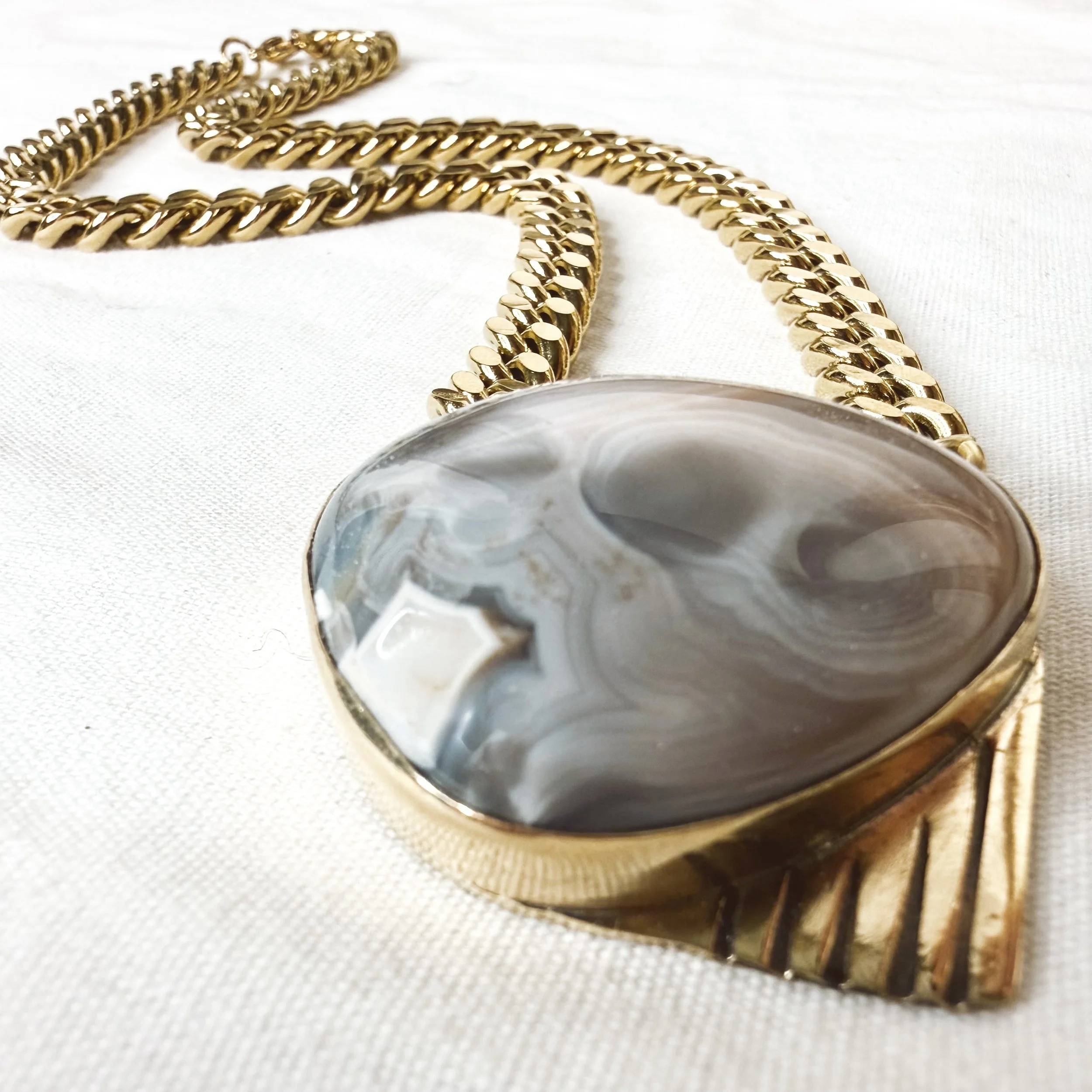 Agate and brass statement pendant on an 8mm 16” gold fill curb chain