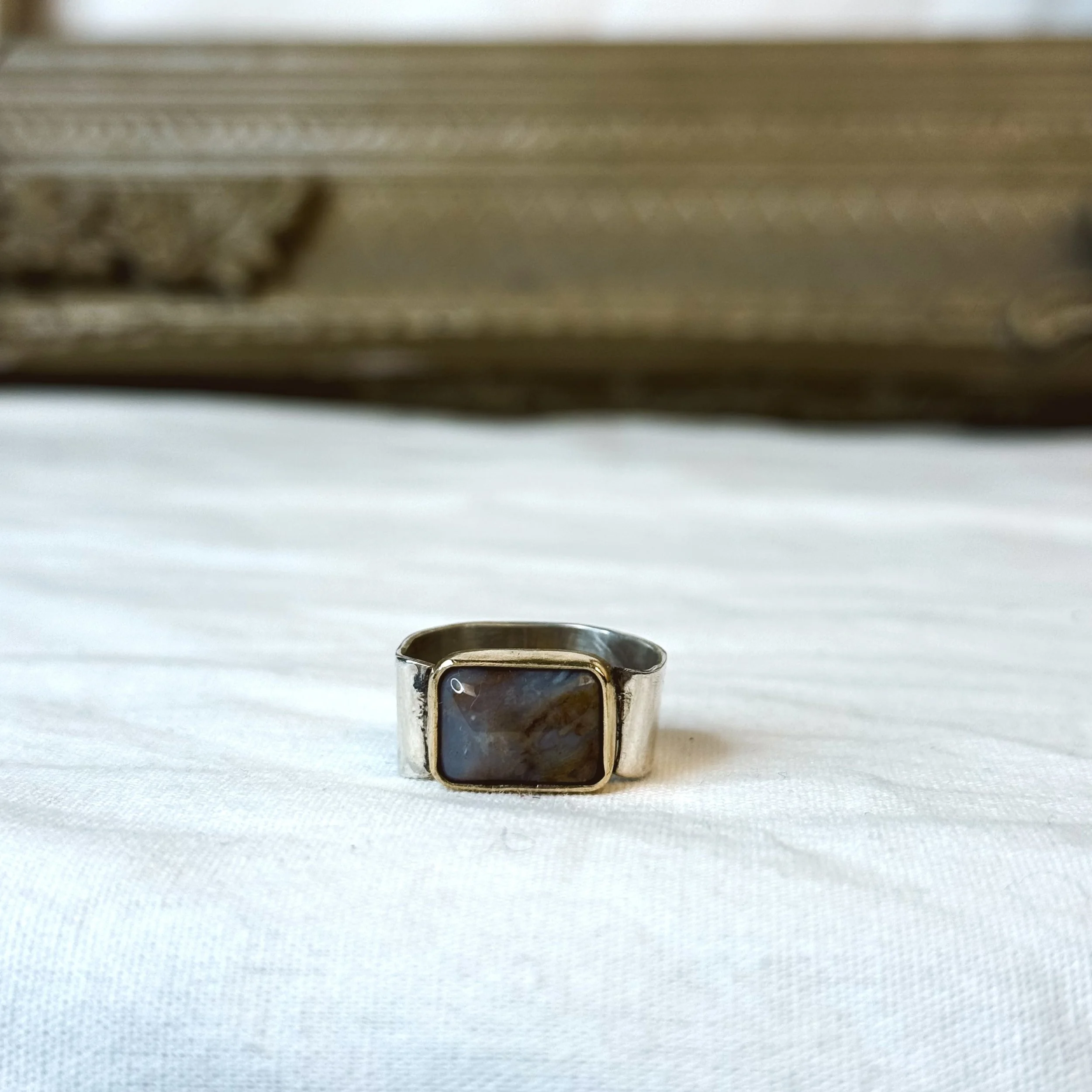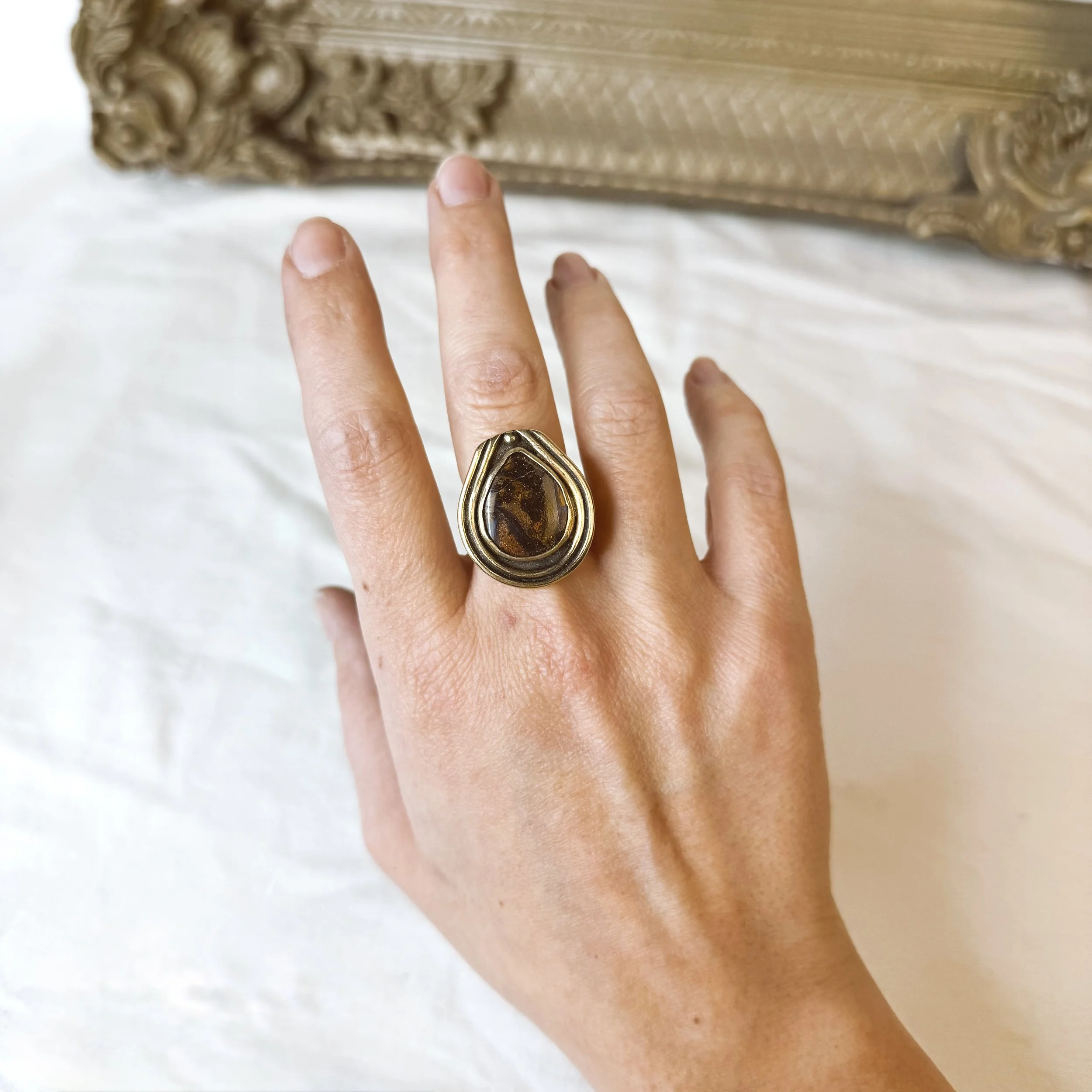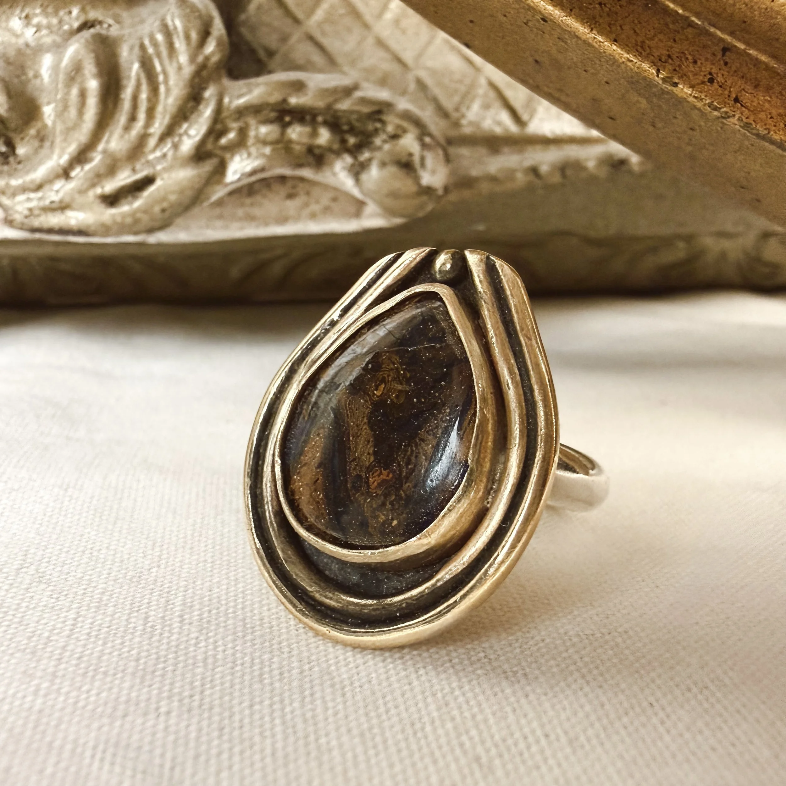 Boulder Opal & oxidized brass ring with adjustable sterling silver ring
